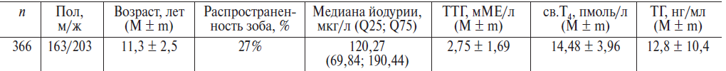 В исследовании приняли участие 366 школьников вторых и третьих классов, возраст варьировал от 7 до 12 лет (в среднем 11,3 ± 2,5 года). Количество девочек немного превышало количество мальчиков, принявших участие в исследовании (203 против 163), но без каких-либо значительных различий от школы к школе. Полные данные о частоте зоба, уровне ТГ и содержании йода в моче и образцах соли были получены у 366 школьников.