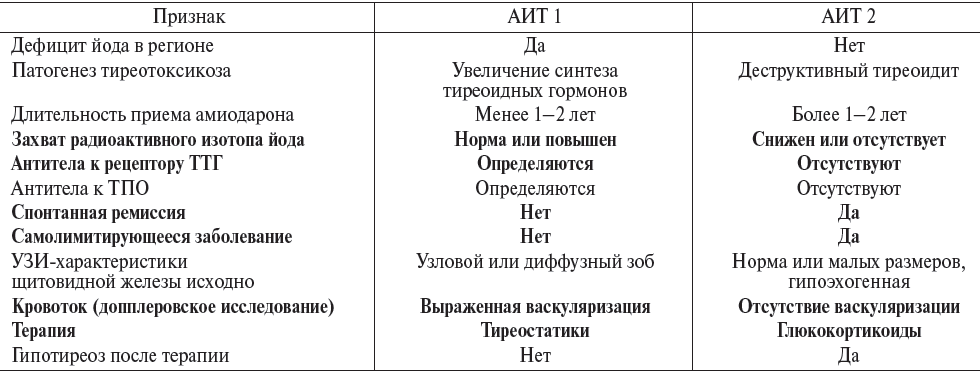 При развитии АИТ 1 типа отмена Ам обязательна. Если возникает необходимость продолжить лечение Ам из-за тяжелых аритмий, необходима превентивная терапия тиреостатиками с последующей струмэктомией или РЙТ. При АИТ 2 типа отмена Ам желательна. Учитывая самолимитирующийся характер процесса, Ам может не отменяться, однако выздоровление наступает позже.