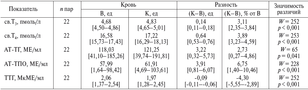 Таким образом, при сравнении результатов функциональной активности щитовидной железы капиллярной и венозной крови необходимо учитывать достоверные отклонения ряда показателей капиллярной крови относительно аналогичных показателей в венозной. В целях мониторинга состояния здоровья пациента во времени результаты целесообразнее сравнивать по одинаковым типам биоматериала либо с поправкой на выявленные отклонения.