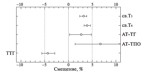Conclusions. Thus, FT3, FT4 and TSH can be determined in the capillary blood without affecting accuracy and precision of clinical evaluation, while for TgAb and TPOAb these deviations may be significant only when the results are in upper borderline values.