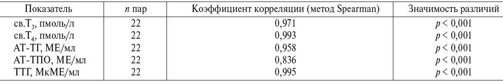 Results. A statistically significant increase in capillary against venous samples was shown for FT3 (mean deviation 3.11; p < 0.001), FT4 (3.89%, p < 0.001), TgAb (2.73%; p = 0.041) and TPOAb (6.75%; p < 0.001), and a decrease – for TSH (-4.3%; p < 0.001). A 5%-deviation is in most cases clinically insignificant for diagnosis and choosing a treatment. All the capillary blood parameters under study strongly correlate (r > 0.75) with the same parameters of the venous blood: r = 0.971 for FT3; r = 0.993 for FT4; r = 0.958 for TgAb; r = 0.836 for TPOAb; r = 0.995 for TSH.