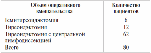 Materials and methods. Our prospective study included 80 patients with BRAF positive PTC, operated from 2009 to 2016 y. Surgical tactics were determined by existing clinical guidelines. To the patients with BRAF positive thyroid cancer it is proposed to perform thyroidectomy with central compartment lymph node dissection. BRAF status was determined by the PCR method in fine needle aspiration biopsy material (FNAB).