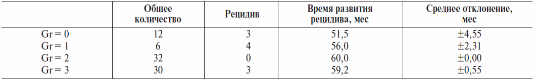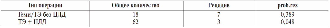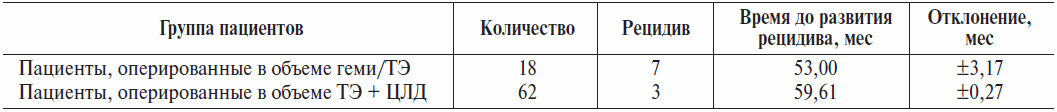 Results. Recurrence was detected in 7 of the 18 patients of the hemi/thyroidectomy group. Among 62 patients from the group of thyroidectomy with central compartment lymph node dissection recurrence was detected only in 3 cases. The mean recurrence time also differed significantly, and in the group of patients with (hemi)thyroidectomy without central compartment lymph node dissection is detected earlier (53 months and 59.61 months). Also, organ-preserving operations without central compartment lymph node dissection in BRAF positive tumor has worse result, regardless of T stage.