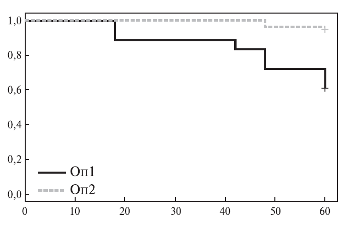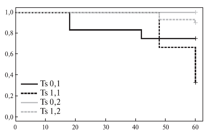6. Fig. 2. Survival curves of patients with BRAF-positive status, depending on the stage T and the volume of the operation. | |