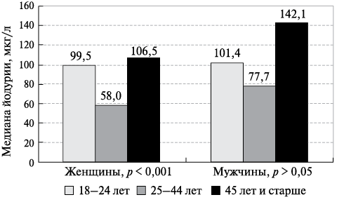 1. Значение медианы йодурии у женщин и мужчин в разных возрастных группах
