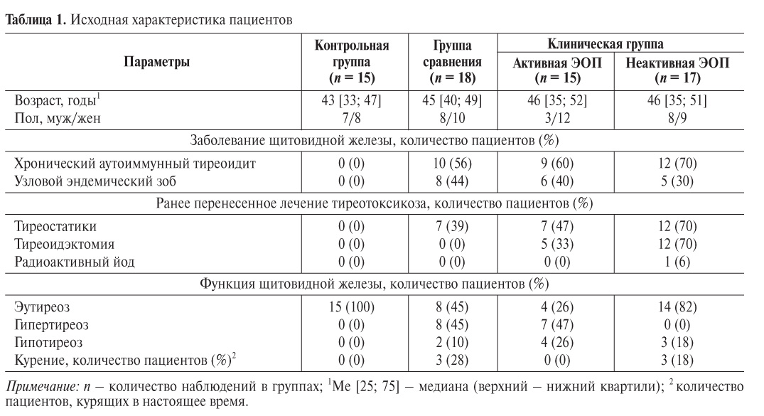 Обследовано 65 человек (26 мужчин и 39 женщин: 130 глаз) в возрасте 43 [35; 50] лет, из числа которых сформированы три группы исследования: 32 пациента со средней степенью тяжести ЭОП разных фаз активности (клиническая группа), 18 пациентов с патологией щитовидной железы без ЭОП (группа сравнения) и 15 здоровых лиц (контрольная группа). В табл. 1 представлена исходная характеристика пациентов, включенных в исследование.
