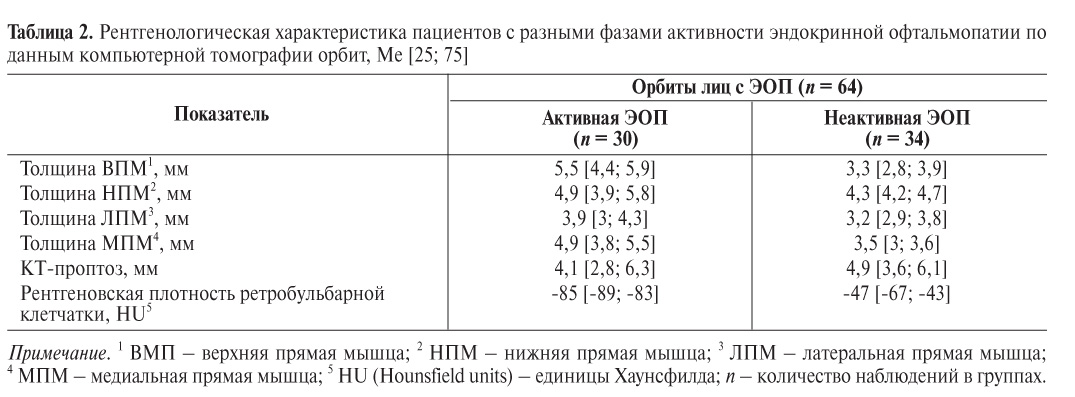 2. Таблица 2. Рентгенологическая характеристика пациентов с разными фазами активности эндокринной офтальмопатии по данным компьютерной томографии орбит, Ме [25; 75]
