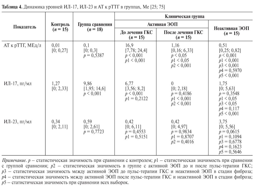 По сравнению с контрольной группой концентрация ИЛ-23 была в 1,75 раза выше в группе сравнения и в 1,25 раза – в активную фазу ЭОП до и после проведения пульс-терапии ГКС. Уровень данного интерлейкина в группе с неактивной фазой ЭОП в стадии фиброза был в 11 раз выше по сравнению с контролем (табл. 4). Однако полученные нами данные не имели достоверных различий в группах (р > 0,05).