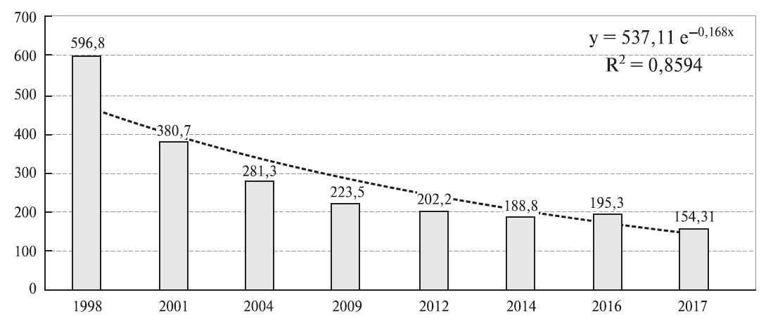Наряду с полевыми исследованиями нами был проведен анализ динамики показателей заболеваемости ПНЗ у детей c 1998 по 2017 г. (рис. 1).