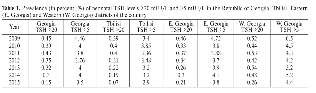 Методы. С 2009 по 2015 г. доля новорожденных с ТТГ >20 мМЕ/л уменьшилась в три раза: с 0,45 до 0,15%. Эта тенденция наблюдалась во всех регионах страны с существенным различием между столицей, западной и восточной частями страны. Частота случаев обнаружения концентрации ТТГ >5 мМЕ/л у новорожденных в Грузии уменьшилась с 4,46% в 2009 г. до 3,5% в 2015 г. Однако только в Тбилиси частота обнаружения концентрации ТТГ >5 мМЕ/л у новорожденных была ниже 3% – уровня отсечения для адекватного питания йодом. В других регионах страны (Западная и Восточная Грузия) частота случаев выявления концентрации ТТГ >5 мМЕ/л у новорожденных составляла 3,8 и 4,4% соответственно, что можно было бы ложно интерпретировать как умеренный дефицит йода.