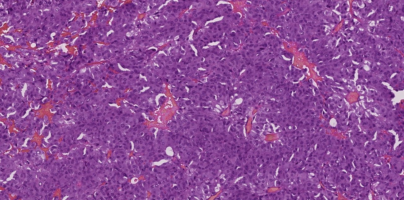 3. Рис. 3а. Гистологическое исследование послеоперационного материала: аденома гипофиза из хромофобных клеток, окраска гематоксилином и эозином (ув. ×100). | |