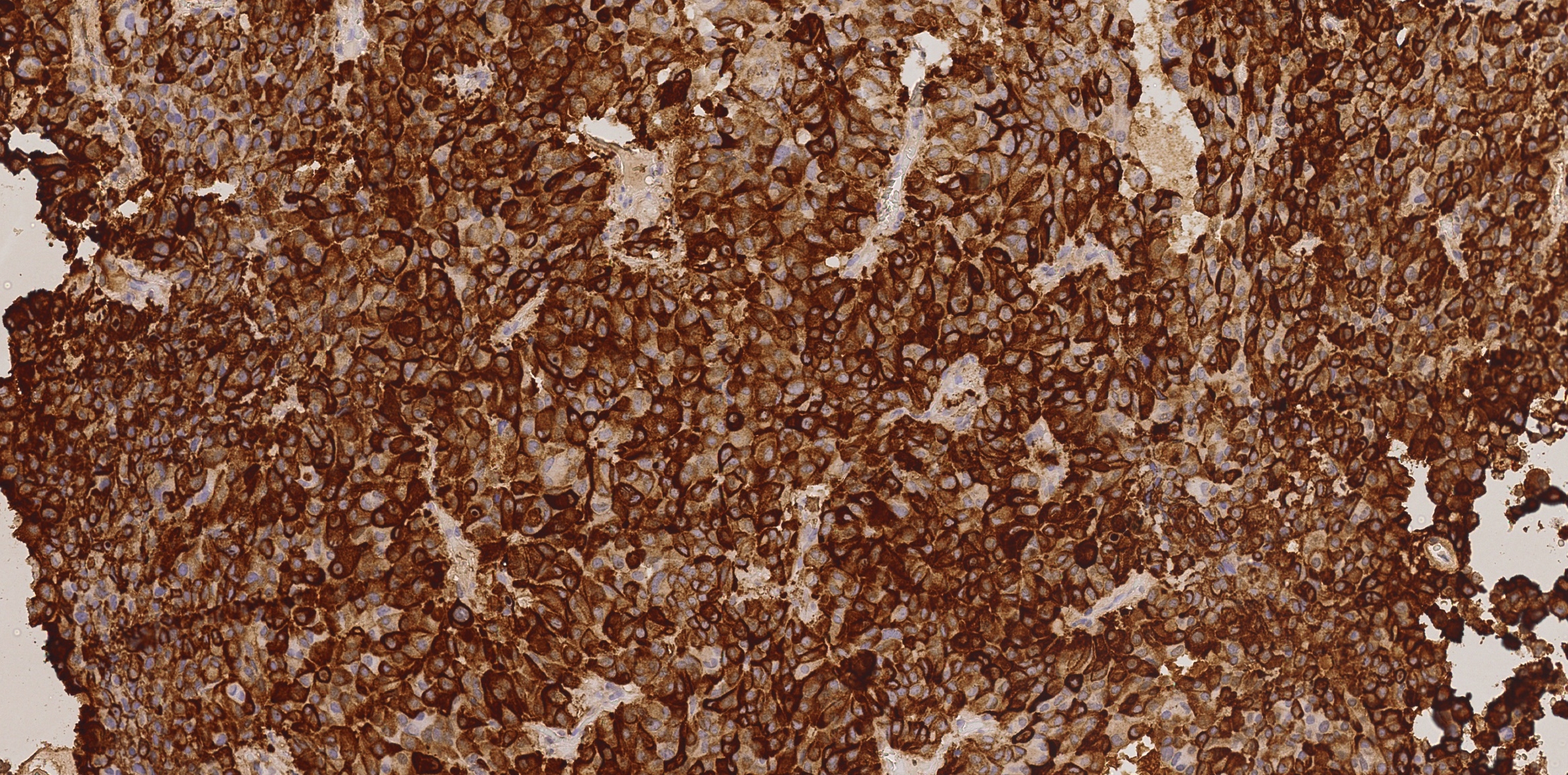 4. Рис. 3б. Иммуногистохимическое исследование с антителами к ТТГ: экспрессия опухолевых клеток до 80% (ув. ×100). | |