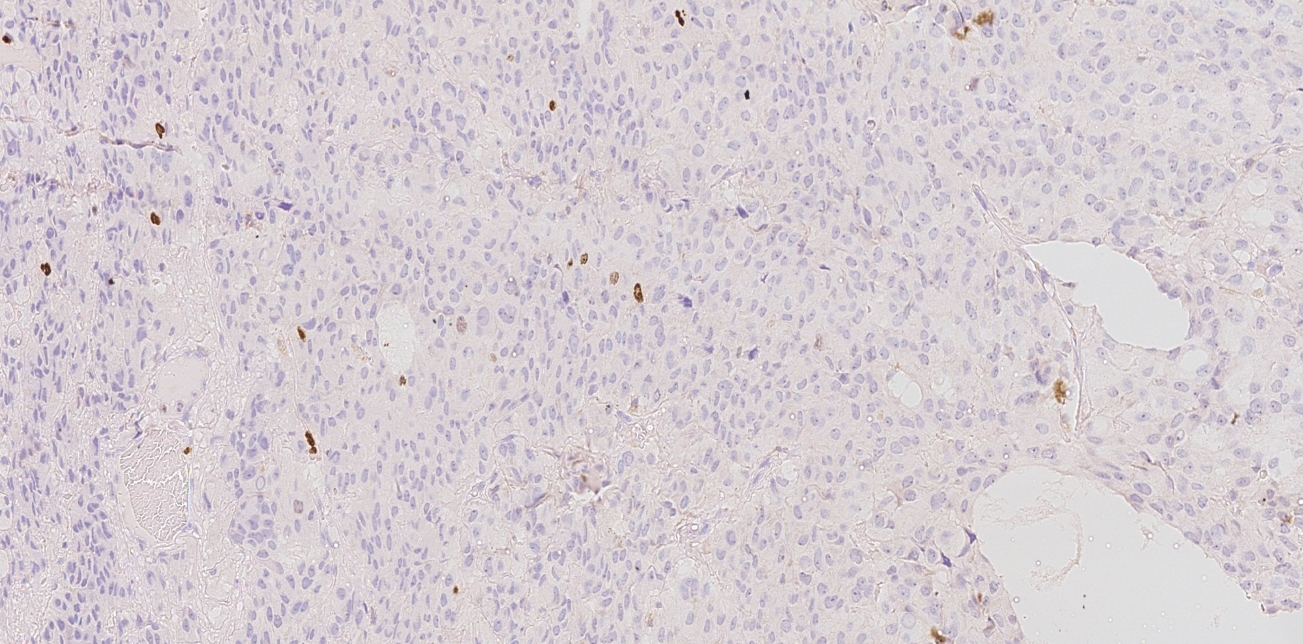 5. Рис. 3в. Иммуногистохимическое исследование с антителами к Ki-67: индекс метки Ki-67 = 1,2% (ув. ×200). | |