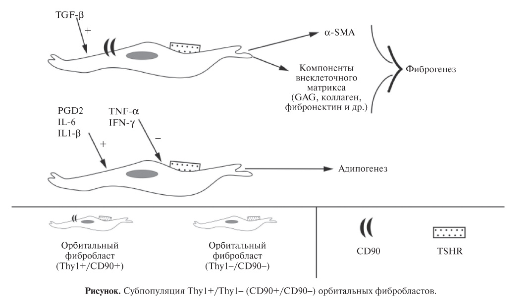 По возможности экспрессии гликопротеина CD90, также известного как антиген тимоцитов-1 (Thy-1 – thymocyte antigen-1), различают две фенотипически и функционально гетерогенные субпопуляции фибробластов (рисунок). Thy1+ или CD90+ фибробласты экспрессируют на своей поверхности Thy-1 и участвуют в ремоделировании и фиброгенезе мягких ретробульбарных тканей [26]. Субпопуляция Thy1- или CD90- не имеет на клеточной мембране маркер Thy-1 и способна к дифференцировке в зрелые адипоциты [2, 4, 6, 26].
