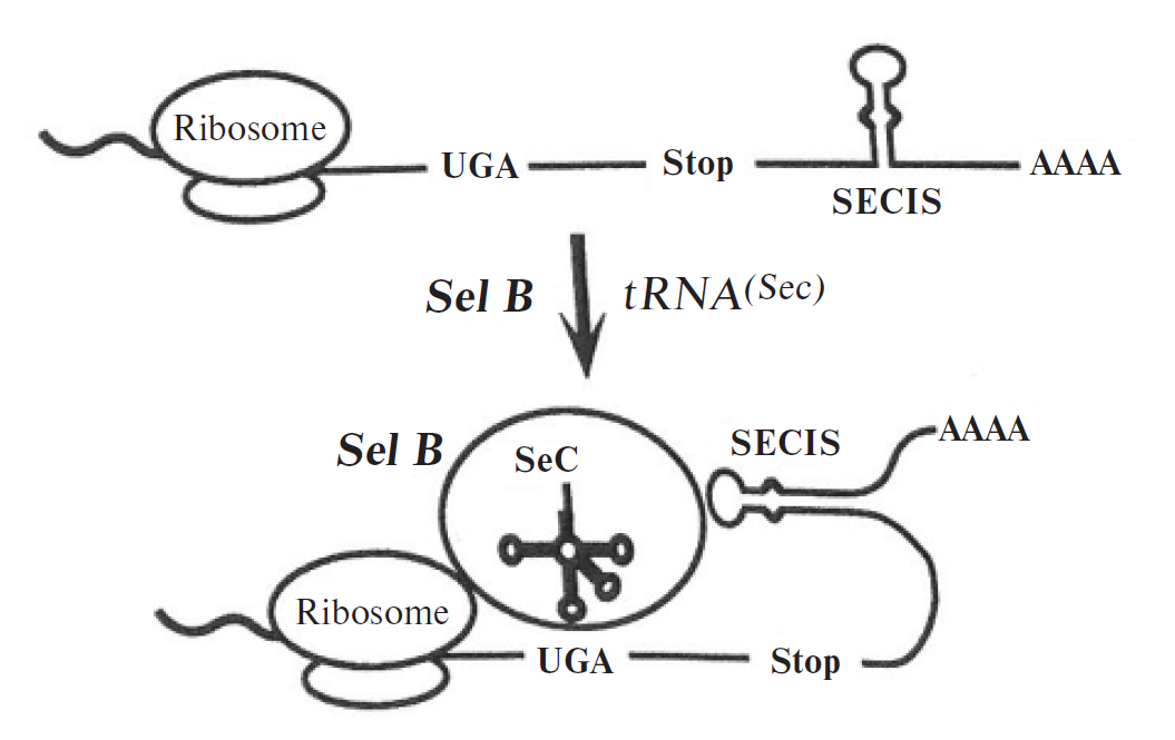 Sec, обеспечивающий активность ферментов, является 21-й аминокислотой и кодируется кодоном УГА (UGA), который является стоп-кодоном и котрансляционно включается в белки с помощью специфической тРНК (рис. 3); то есть на рибосоме происходит трансляция стоп-кодона в виде Sec с помощью специфической структуры основной цепи мРНК, которая находится в 3’-нетранслируемом участке. Структура основной цепи (SECIS) образует часть комплекса, включающего связывающий белок (SBP2) и специфичный фактор элонгации (EFsec), которые переносят Sec тРНК в свободный рибосомальный участок, превращая стоп-кодон в селеноцистеиновый кодон [7]. Недавно Carlson и соавт. продемонстрировали новые методы выделения и секвенирования тРНК селеноцистеина, открыв ранее неизвестные области изучения протеасомы селенсодержащих белков [12].