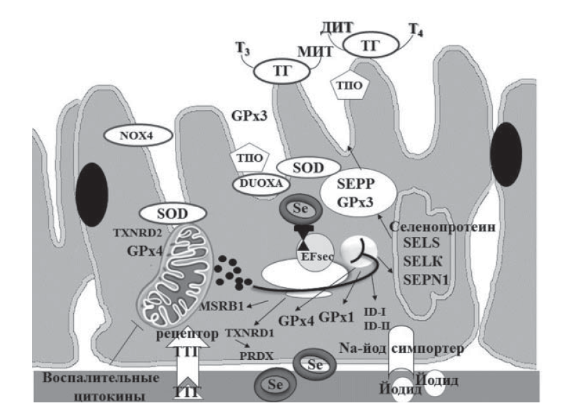 Тиреоциты продуцируют большое количество Н2О2, связанного с синтезом тиреоидных гормонов. Высокий уровень Н2О2 подвергает железу разрушению под действием свободных радикалов (активных форм кислорода, АФК), в таком случае требуется антиоксидантноедействие селенопротеинов, таких как GPX1, GPX3 и TXNRD1, которые изменяют “редокс-статус” и защищают ЩЖ от окислительного повреждения [17]. Тиреопероксидаза (ТПО) катализирует реакцию окисления йодида Н2О2, в результате которой образуется активная форма йодида, присоединяющаяся к тирозильным остаткам тиреоглобулина. Синтез Н2О2, вероятно, осуществляется под действием НАДФ-оксидазы в присутствии ионов кальция. Данный процесс стимулируется тиреотропным гормоном (ТТГ) через сложную систему вторичных мессенджеров и, по всей видимости, ограничивает синтез гормонов ЩЖ при наличии достаточного количества йода. Такой механизм позволяет быстро использовать Н2О2, образующийся на поверхности тиреоцитов, для реакций йодирования, в то время как внутриклеточный Н2О2 расщепляется антиоксидантными ферментами – GPX, TR и каталазами [13, 14].