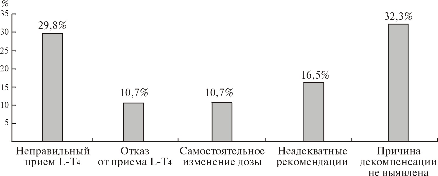 Primary hypothyroidism is one of the most common endocrine diseases. Levothyroxine is the treatment of choice due to its efficacy, good tolerance, simplicity of a dose titration, low cost and long elimination half-life. Replacement therapy for hypothyroidism is simple and convenient, but from 30 to 60% of patients are in a state of decompensation. Over- or underreplacement with L-T4 may lead to serious adverse events such as decreased performance and mood, deterioration of health and quality of life, developing of cardiovascular diseases, cardiac arrhythmias and bone fractures. The most common reasons for failure to compensate for the disease are improper administration of the drug (after eating, drinking coffee and milk immediately after levothyroxine), non-compliance with storage conditions (use after the expiration date, excessive heat), insufficient patient adherence to treatment (skipping the drug), the effect of other medicines drugs (calcium, iron preparations, proton pump inhibitors, etc.), diseases of the gastrointestinal tract (atrophic gastritis, celiac disease). Given many factors influencing the achievement and maintenance of compensation for hypothyroidism, it is necessary to determine and, if possible, eliminate the main factor leading to decompensation before the dose adjustment.