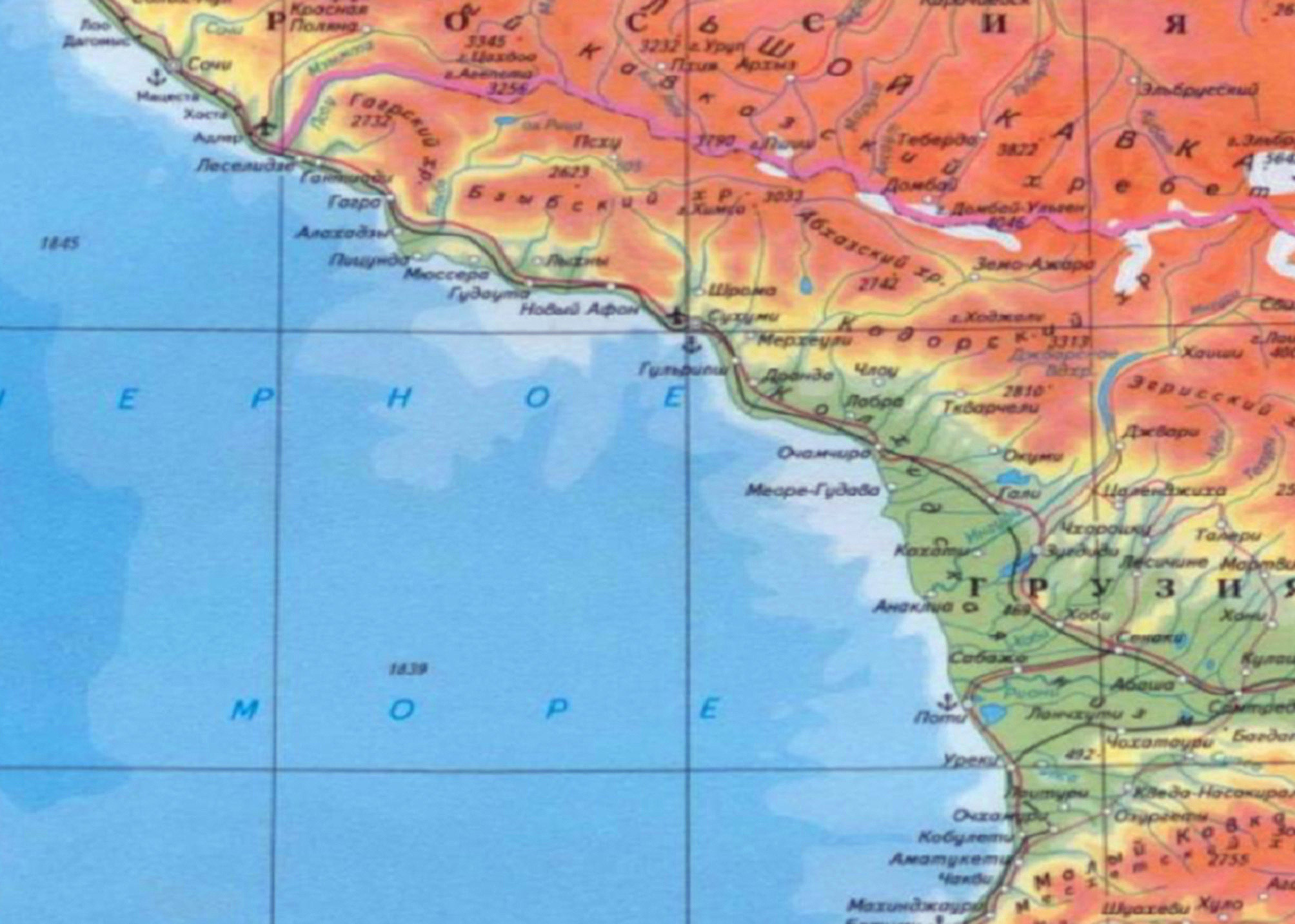 Перед тем как начать обсуждение основных источников йода в питании населения России, прошу уважаемых читателей обратить внимание на карту Восточного Причерноморья (см. рисунок). Когда-то это было территорией одного государства, а теперь живописное побережье длиной около 500 км принадлежит двум суверенным и одному частично признанному государству. Географически это побережье весьма сходно: с одной стороны море, с другой – Кавказские горы, посередине – полоса земли. При различии в национальном составе, пищевые привычки жителей Восточного Причерноморья достаточно однородны. Но вот по уровню йодной обеспеченности проживающего там населения эти территории отличаются буквально на порядок.