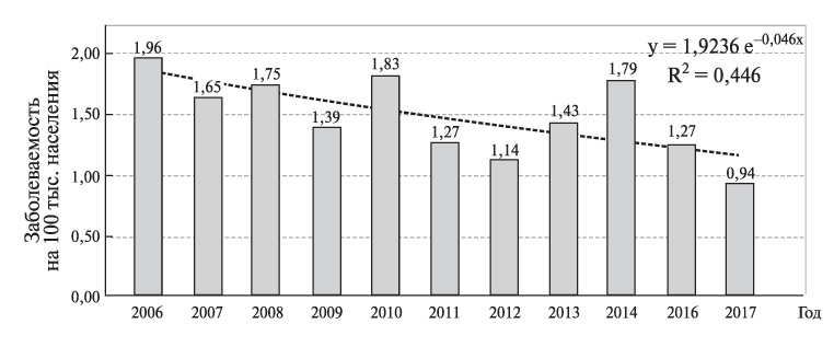 Рис. 5. Динамика показателей первичной заболеваемости врожденным гипотиреозом по результатам неонатального скрининга в Беларуси с 2006 по 2017 г. [5].