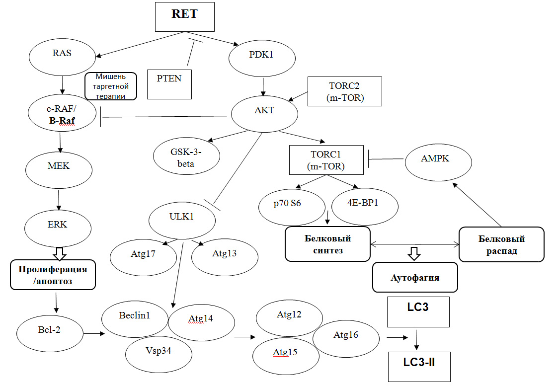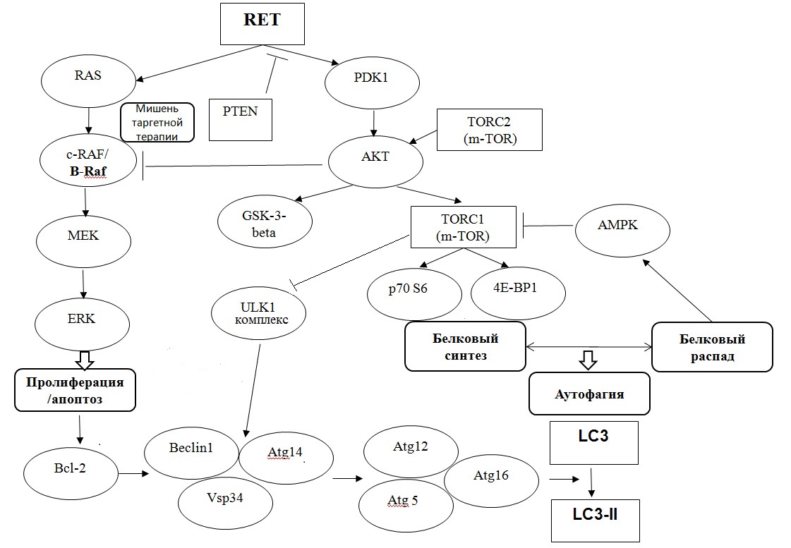 Примечание. Развитие папиллярного рака щитовидной железы связано с активацией онкобелков B-Raf, RET, сопровождающейся изменением состояния AKT/mTOR сигнального каскада. Одним из основных процессов, связанных с онкогенезом, является аутофагия, которая обеспечивает белковый баланс в клетке. mTOR в составе комплекса TORC1 является ключевой киназой данного обмена, регулирующей процессы белкового синтеза и распада, а также влияющей на прогрессию опухоли, в частности на пролиферацию клеток и их апоптоз. Подробно механизм описан в разделе “Молекулярные механизмы, вовлеченные в развитие аутофагии”.